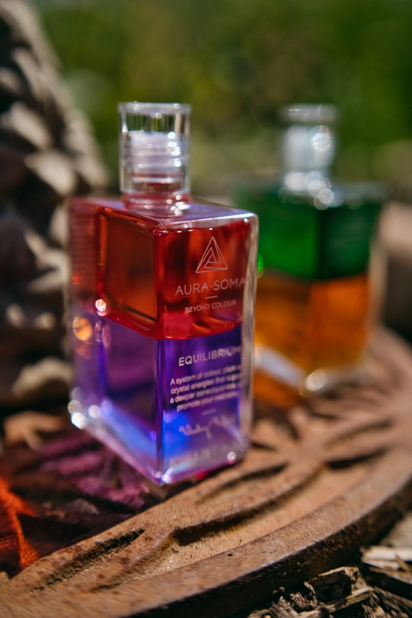 Das Herzstück von Aura-Soma sind die sogenannten "Equilibrium-Flaschen" oder "Farbflaschen". Jede Flasche enthält zwei Schichten von verschiedenfarbigen Ölen und Wasser. Die obere Schicht besteht aus farbigem ätherischen Öl, während die untere Schicht aus Pflanzenextrakten und Wasser besteht. Diese Flaschen werden verwendet, um energetische Blockaden aufzulösen und das Gleichgewicht im Körper, im Geist und in der Seele wiederherzustellen.
